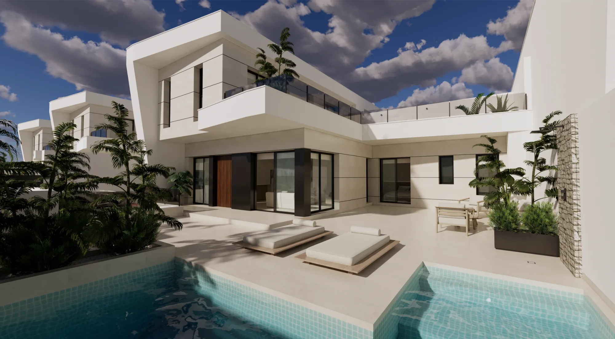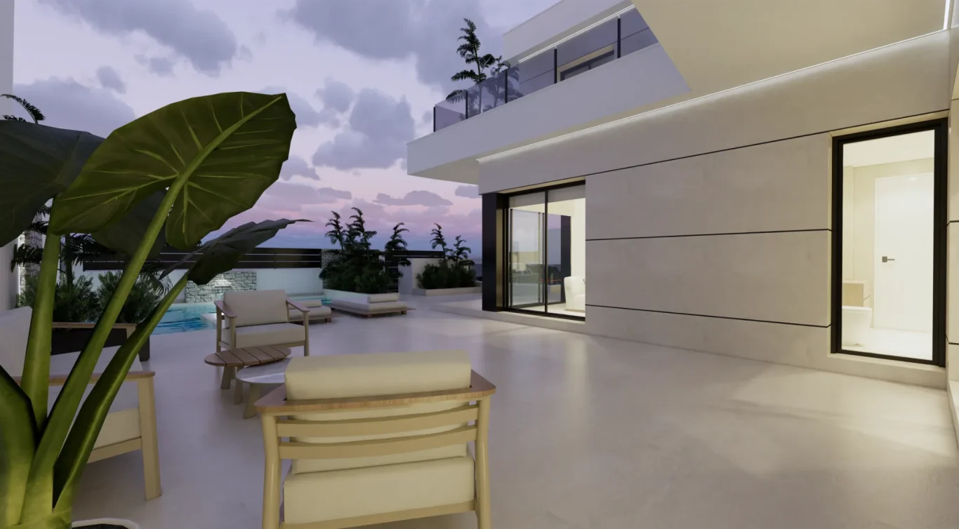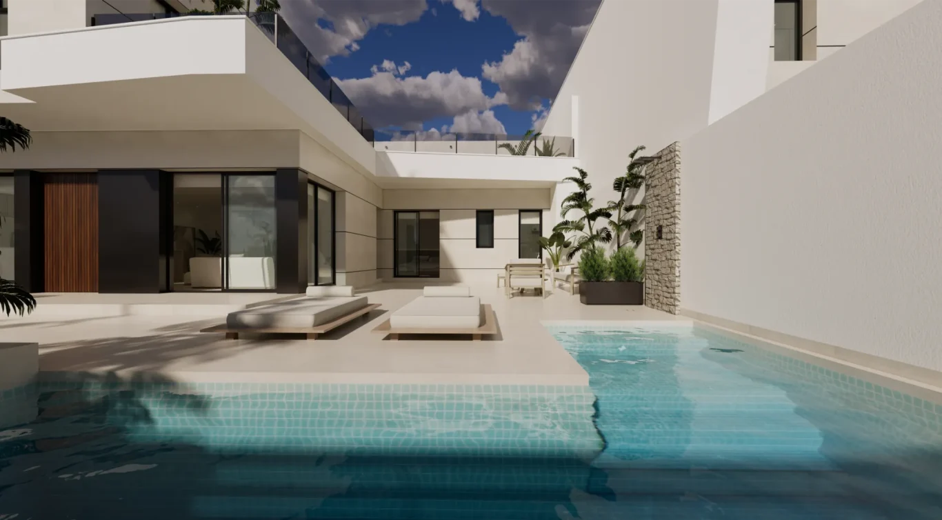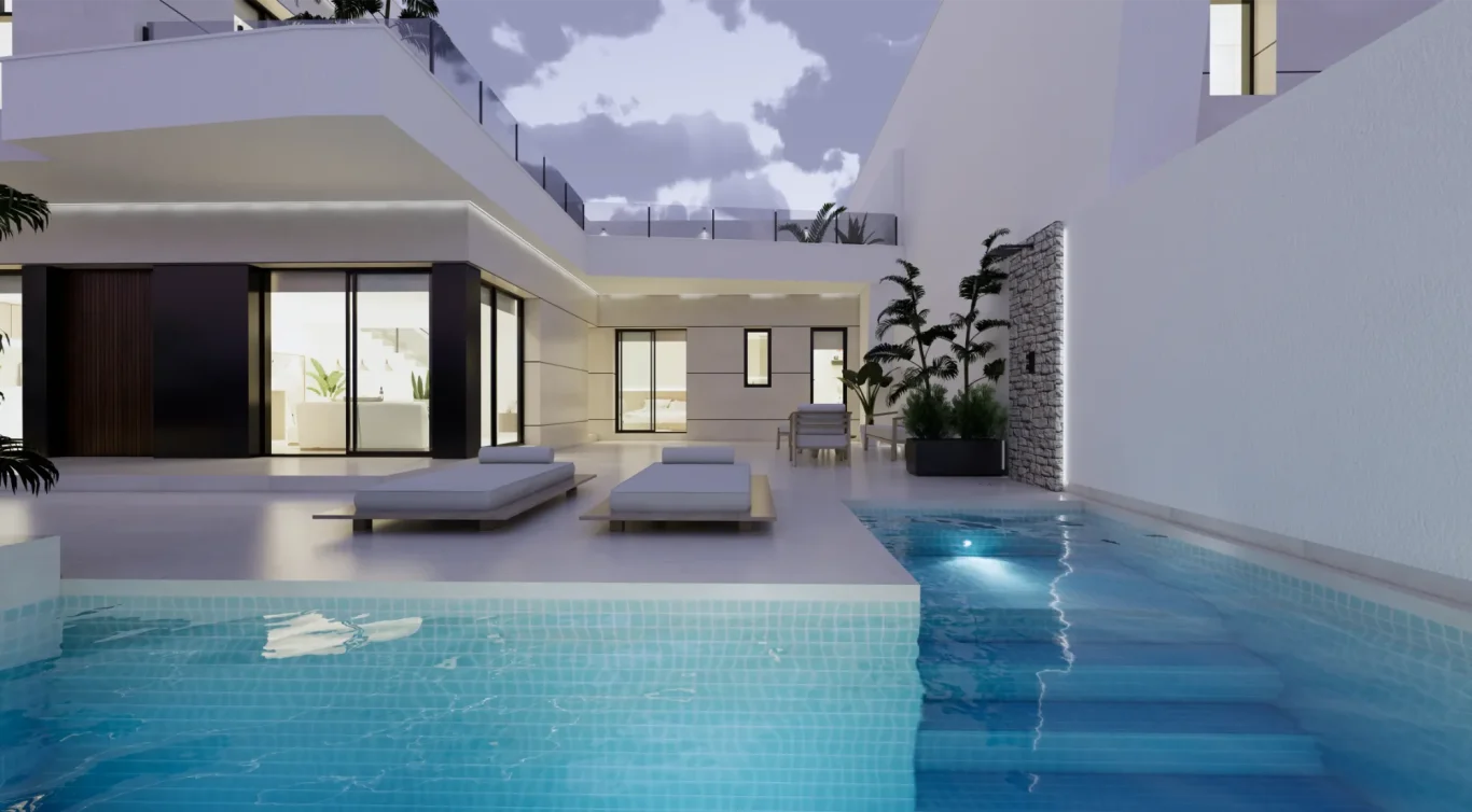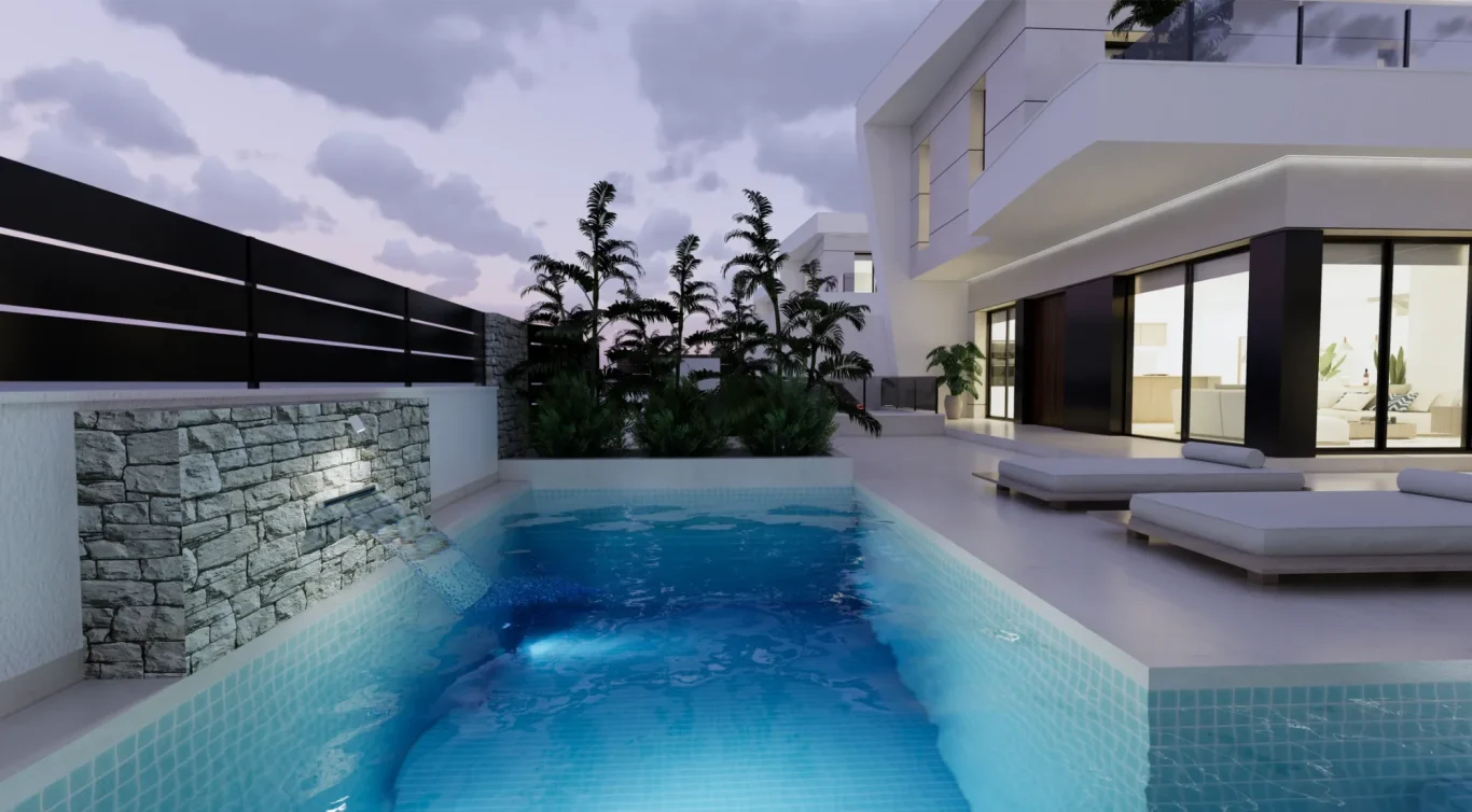 Vida exterior de lujo: Cada villa cuenta con una piscina privada con cascada, amplias terrazas tipo solárium y zonas ajardinadas, creando un espacio perfecto para el relax y el ocio.