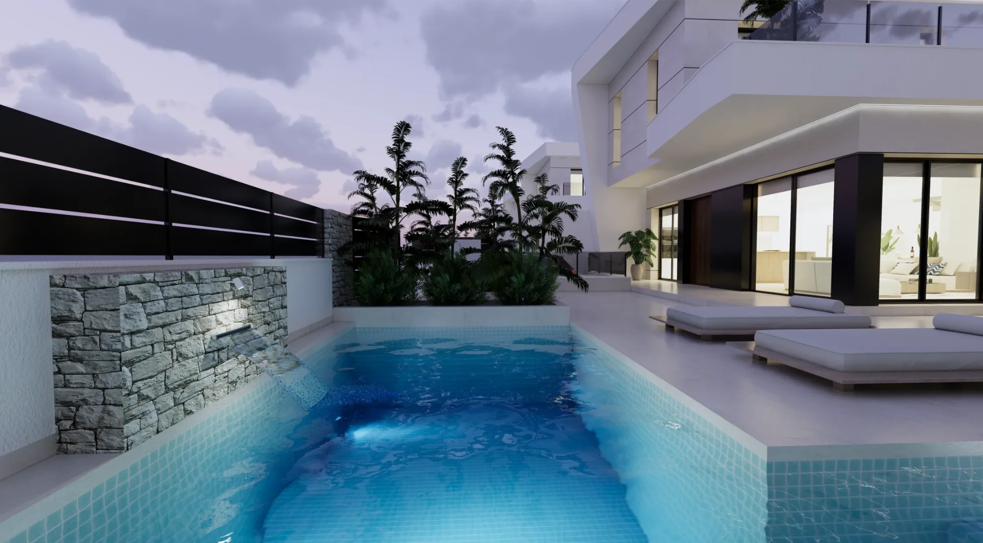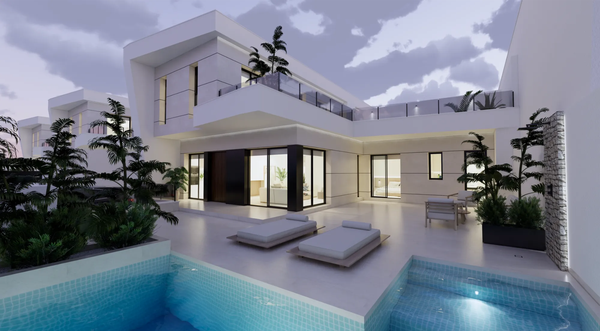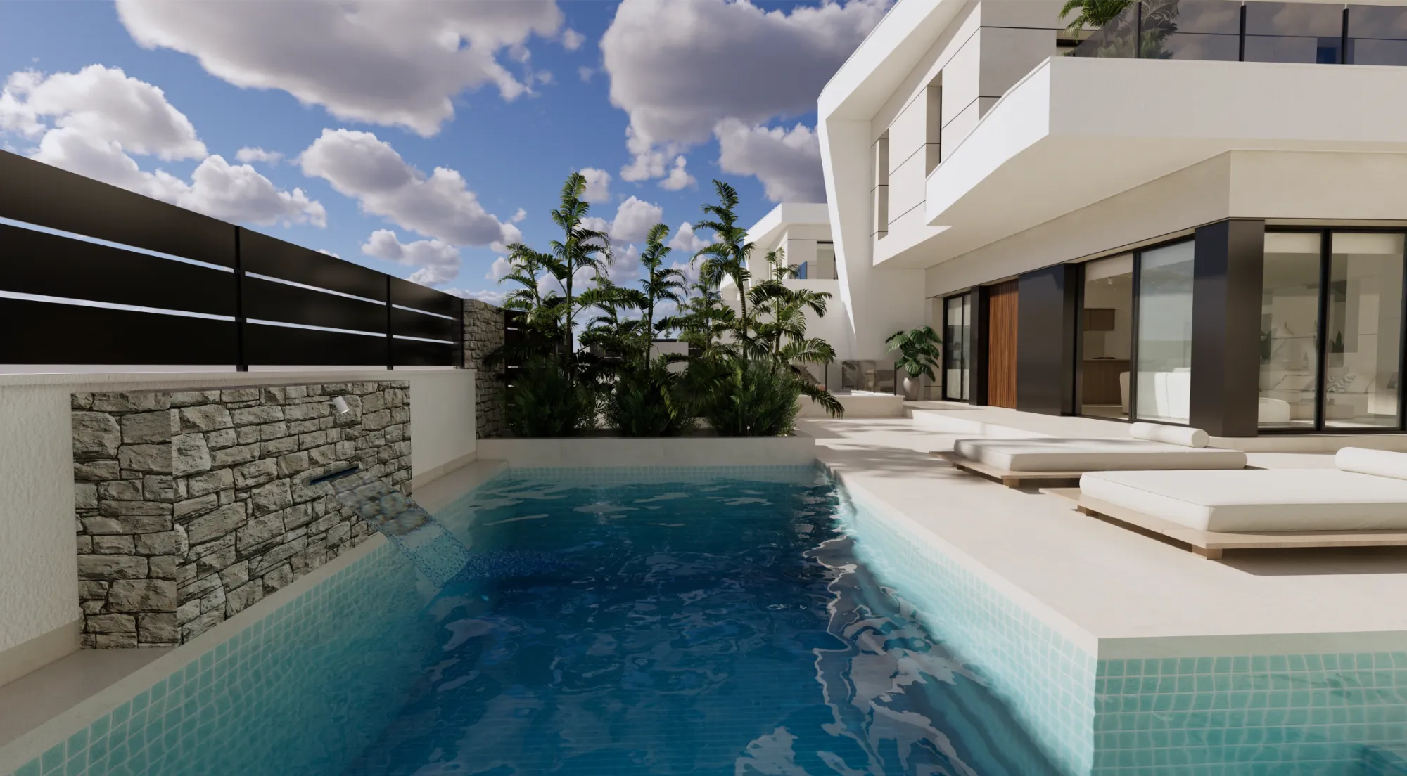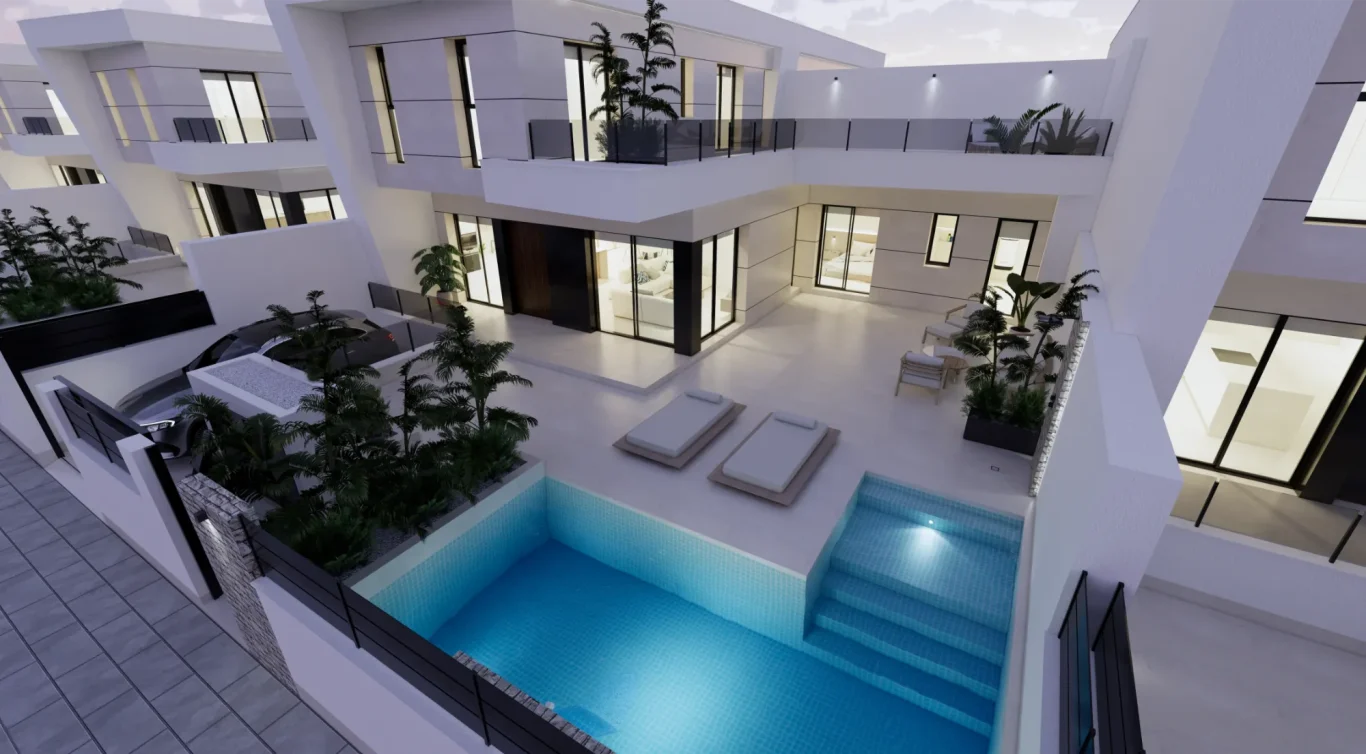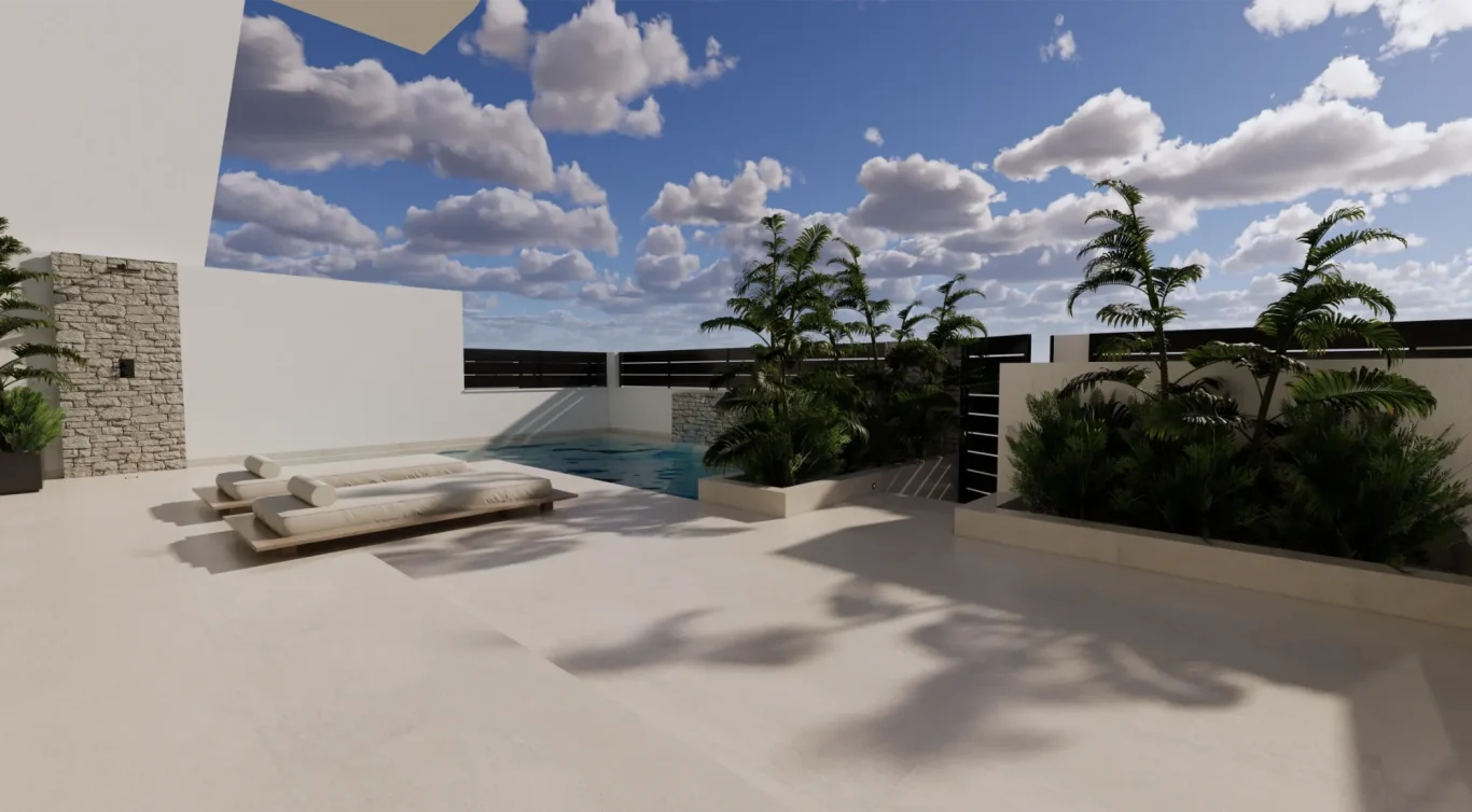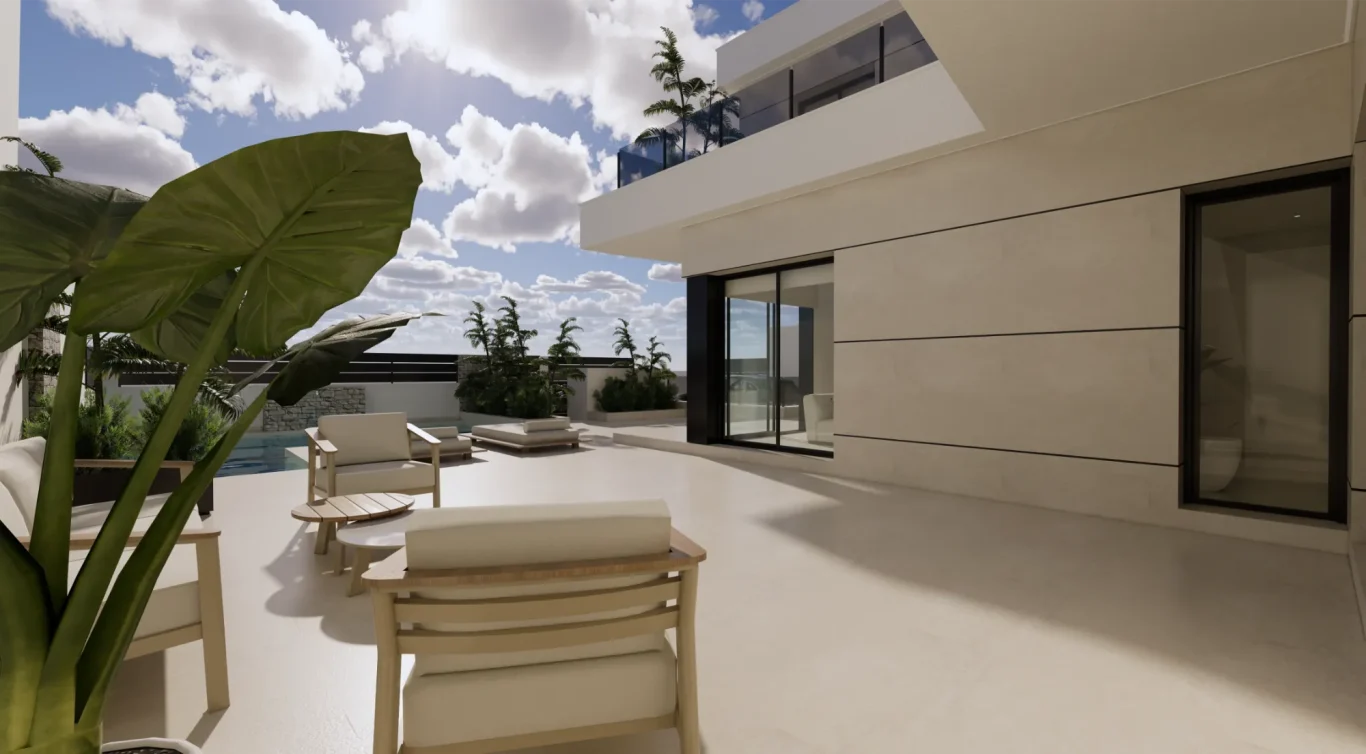 Vida exterior de lujo: Cada villa cuenta con una piscina privada con cascada, amplias terrazas tipo solárium y zonas ajardinadas, creando un espacio perfecto para el relax y el ocio.