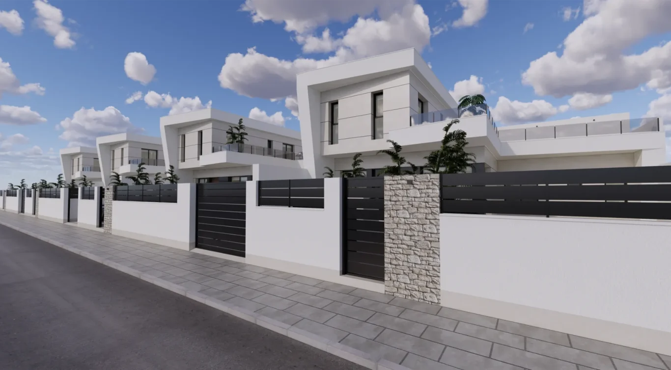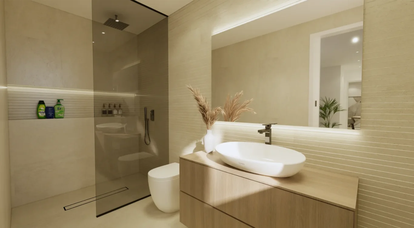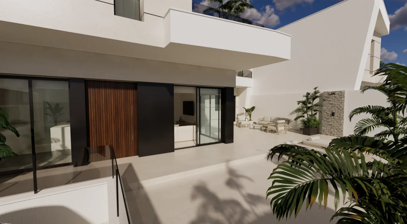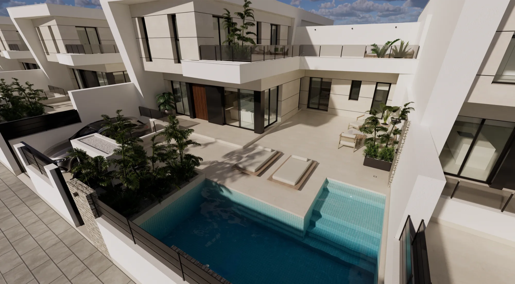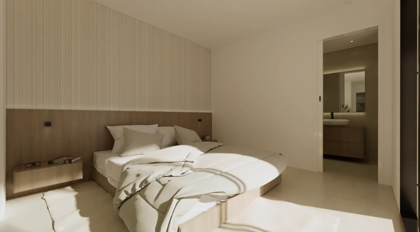 Vida exterior de lujo: Cada villa cuenta con una piscina privada con cascada, amplias terrazas tipo solárium y zonas ajardinadas, creando un espacio perfecto para el relax y el ocio.