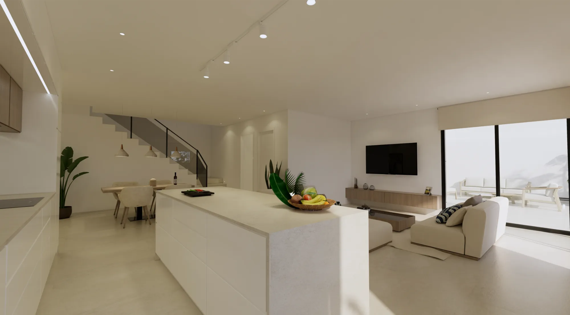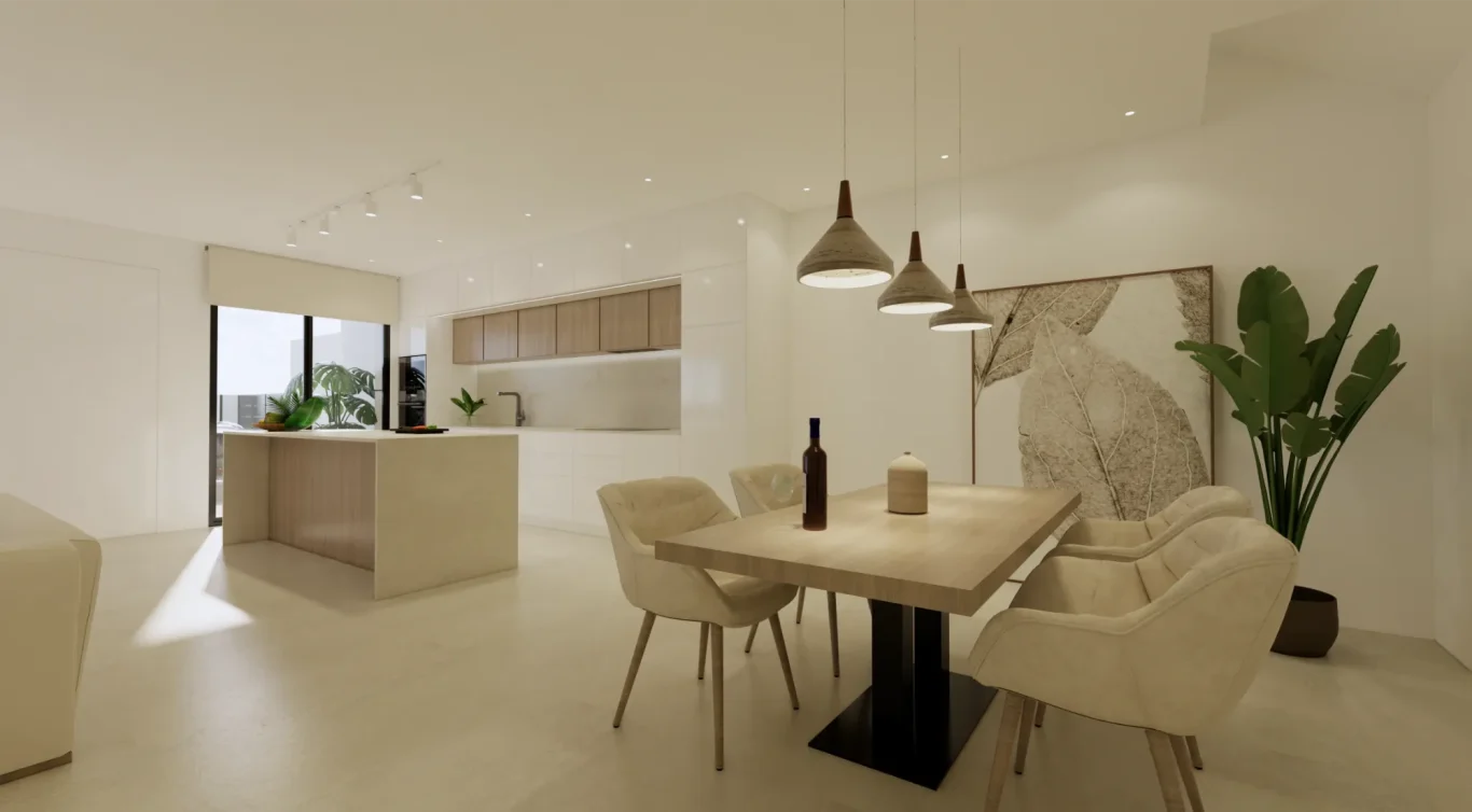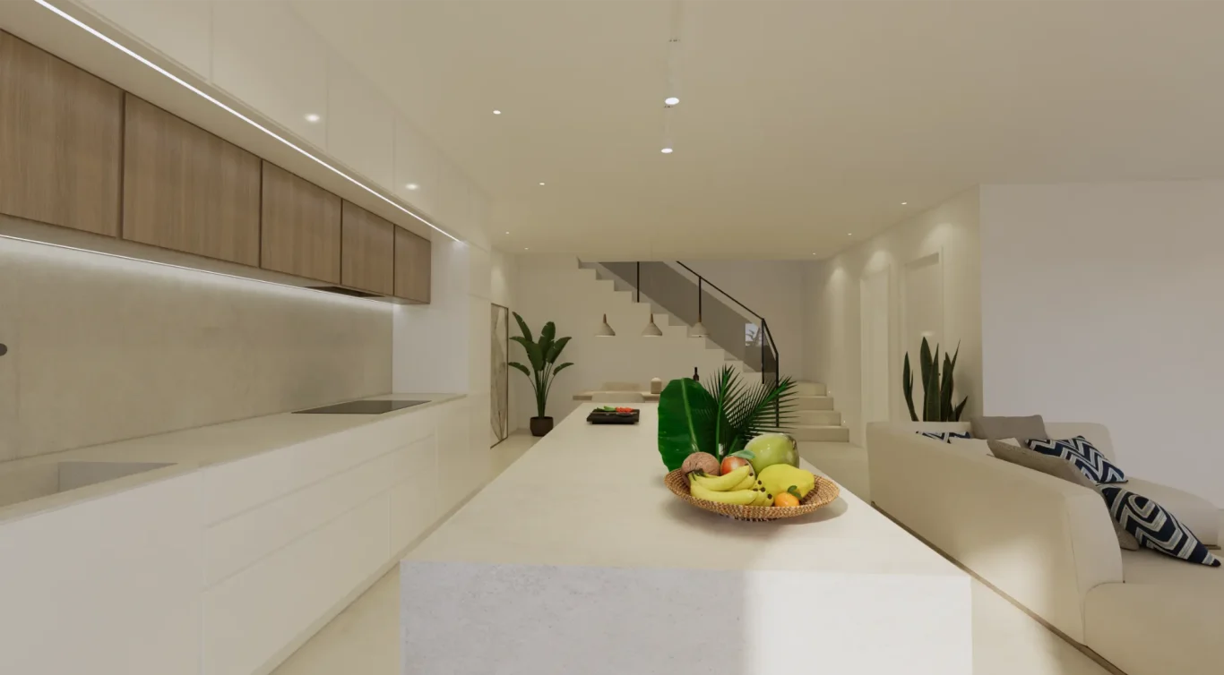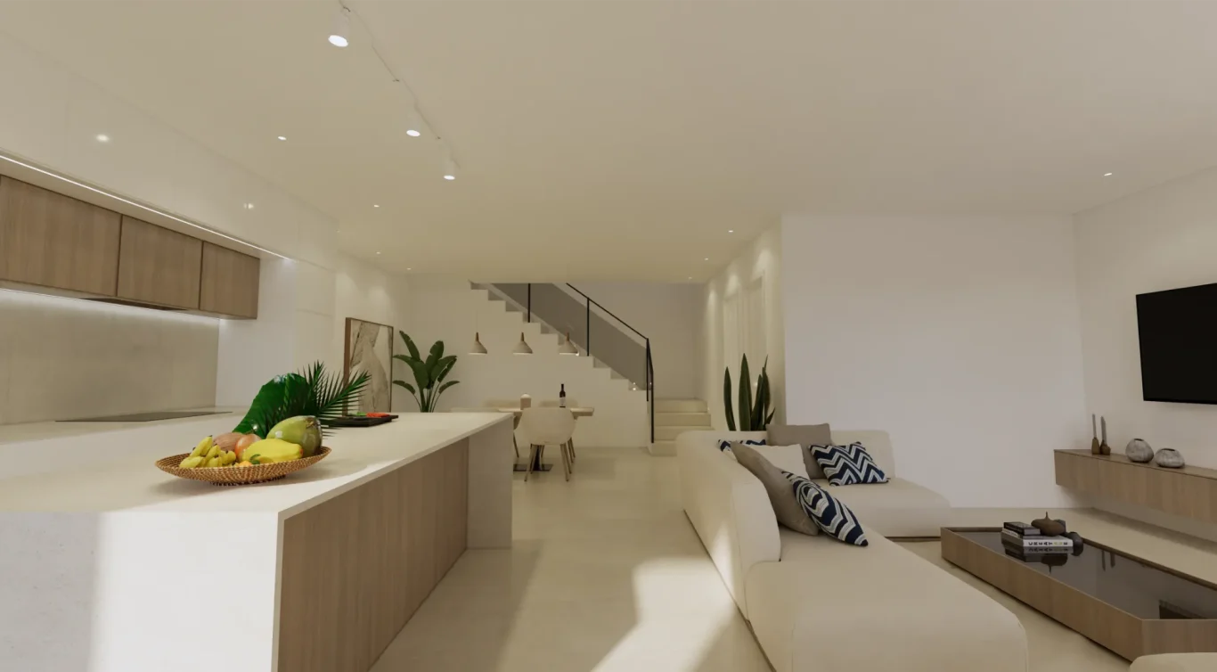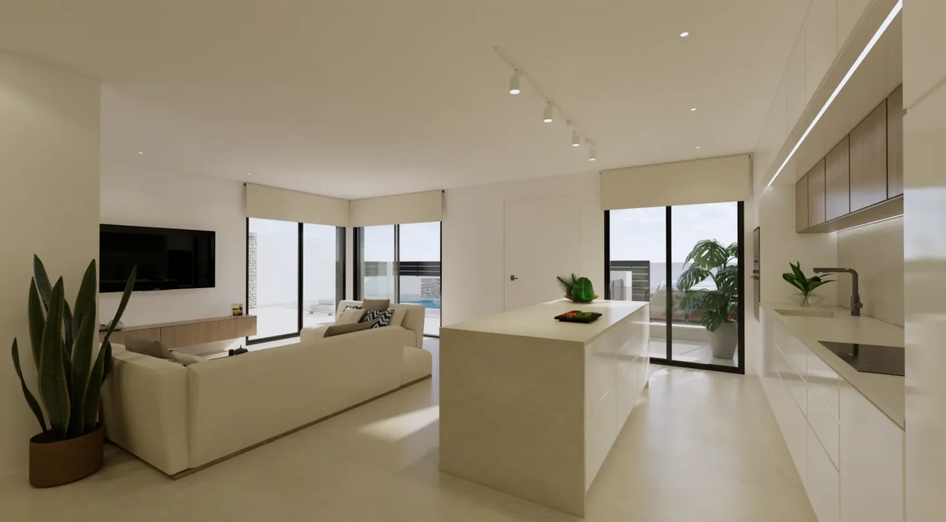 Interiores luminosos y de concepto abierto: La planta baja se centra en un diseño de concepto abierto que une una moderna cocina con isla central y el salón-comedor. Los grandes ventanales proporcionan luz natural y conectan el interior con la terraza exterior.