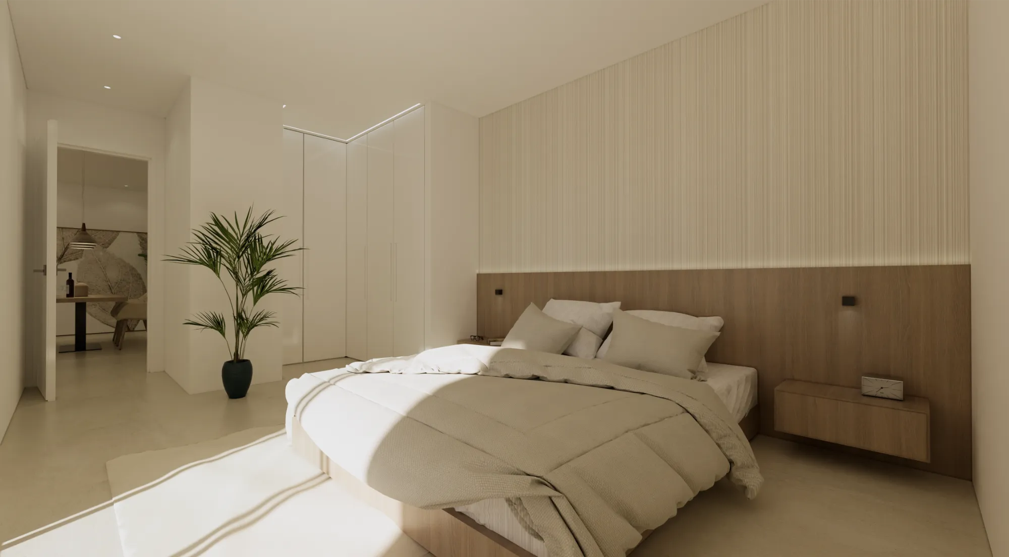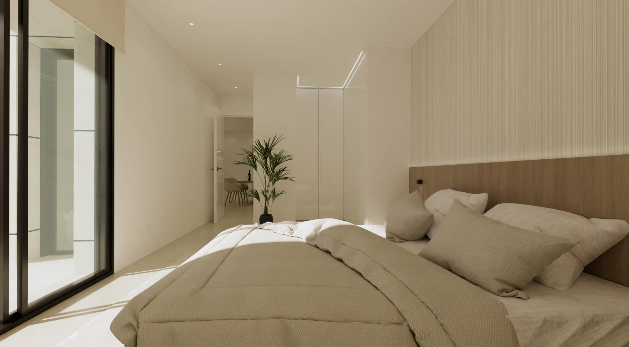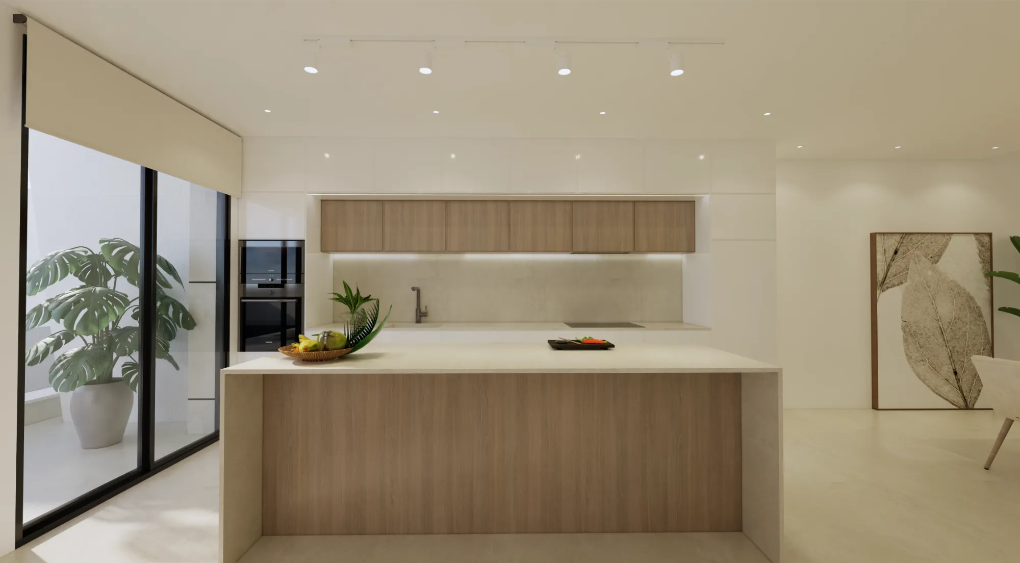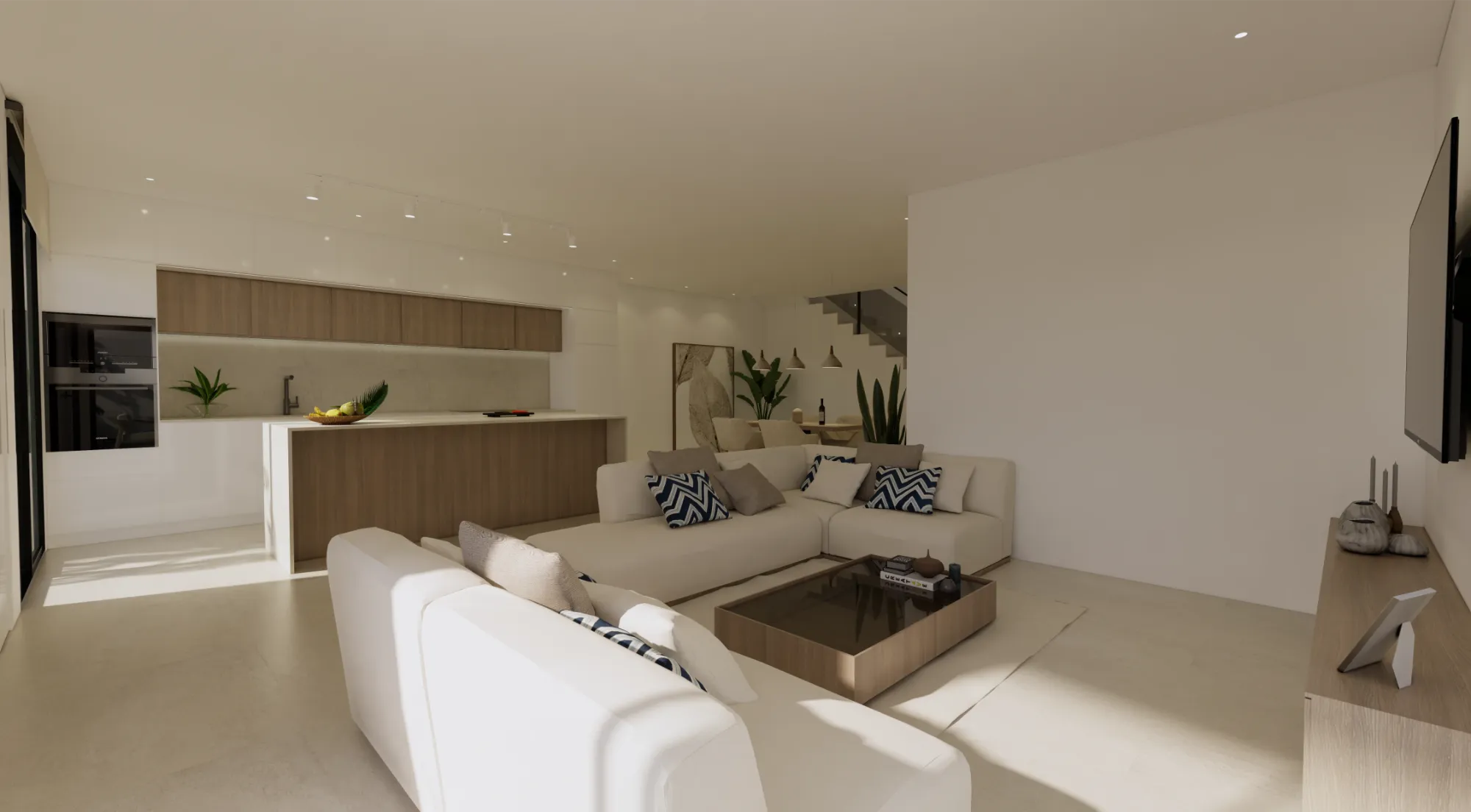 Interiores luminosos y de concepto abierto: La planta baja se centra en un diseño de concepto abierto que une una moderna cocina con isla central y el salón-comedor. Los grandes ventanales proporcionan luz natural y conectan el interior con la terraza exterior.